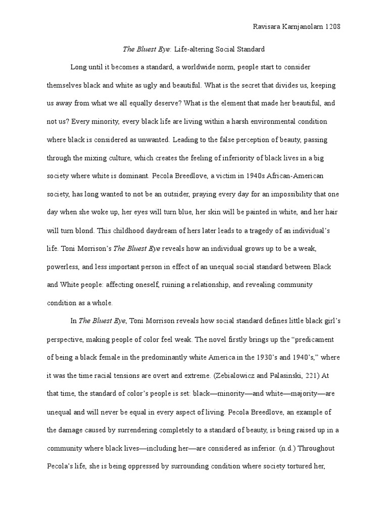 Conclusion The Bluest Eye, written by Toni Morrison in the year , places two things together in the twentieth century in the United States. The novel is mainly about the tragic life of the main character, Pecola Breedlove, a young African American girl, in the year that experienced different kinds of social issues that were depicted in the novel Yes, segregation is illegal and has been for over fifty years, but that still didn’t change the way people looked, treated, or thought of us. The Bluest Eye was nothing but the truth about how African American women were treated back then, and the novel was able to present three important themes: appearance, race, and · The Bluest Eye Essay #4 by: Jason Berry EWRT 1B Instructor: C. Keen June 16th Toni Morrison the author of The Bluest Eye, portrays the character Pecola, an eleven year old black girl who believes she is ugly and that having blue eyes would make her beautiful, in such a way as to expose and attack “racial self- loathing” in the black community